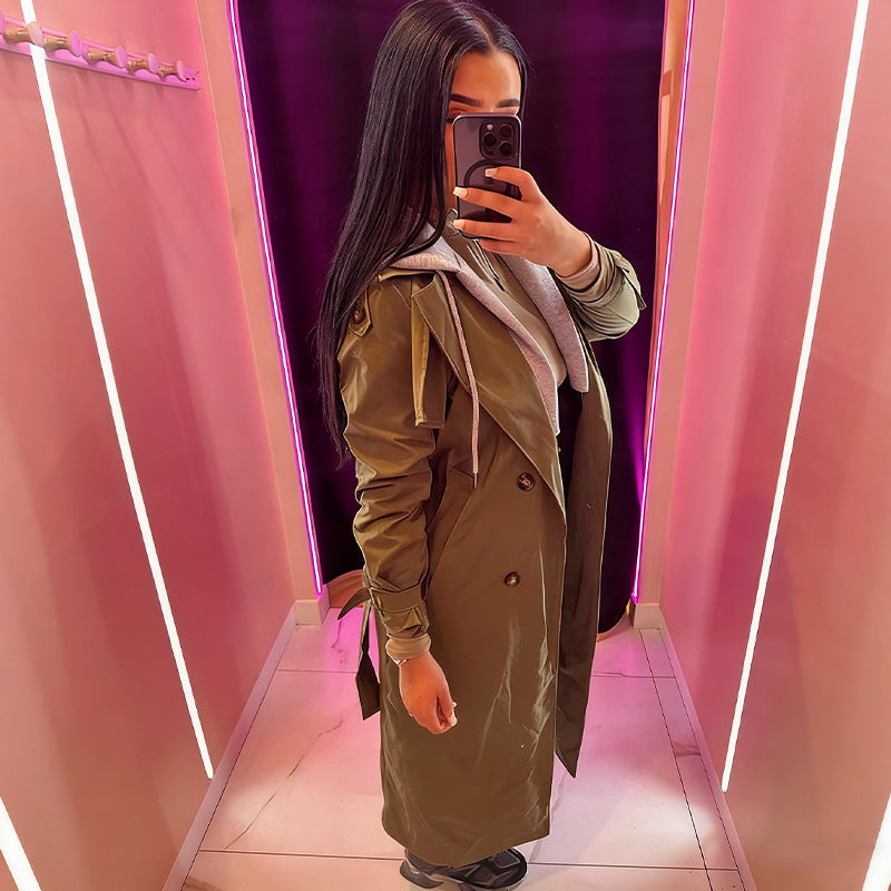 INNOVATIVE FAKE TWO-PIECE DESIGN - Masterfully combines a hooded sweatshirt collar with a trench coat body in one seamless garment, creating the illusion of sophisticated layering without actual bulk. The clever construction features a V-neckline that elongates the silhouette while the attached hood provides practical coverage, blending sporty comfort with tailored elegance in a single revolutionary design.